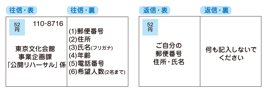 | 往信・表 | 〒110-8716 東京文化会館 事業企画課 「公開リハーサル」係 |